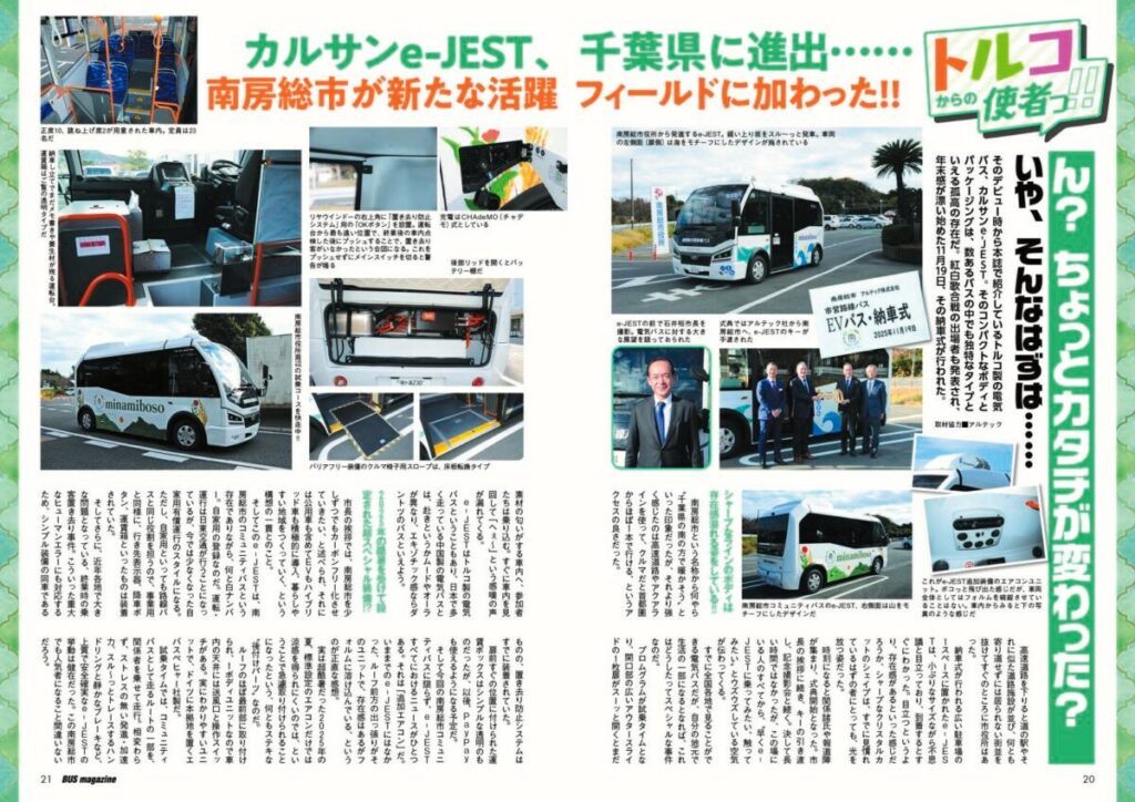 全国各地で続々と運行が開始、増便されているコミュニティバス。緻密なフットワークが地域の人々の交通インフラとして機能している。そしてここ数年は、そこに電気バスの採用が目立っている。トルコ製のカルサンe-JESTは、クリスタルカットのフォルムを持つ全長7m未満の超小型電気バスだ。バスマガジンでもその活躍を各地でキャッチしているが、今回は南房総市で採用されたニュースを紹介する。