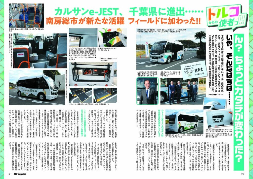 全国各地で続々と運行が開始、増便されているコミュニティバス。緻密なフットワークが地域の人々の交通インフラとして機能している。そしてここ数年は、そこに電気バスの採用が目立っている。トルコ製のカルサンe-JESTは、クリスタルカットのフォルムを持つ全長7m未満の超小型電気バスだ。バスマガジンでもその活躍を各地でキャッチしているが、今回は南房総市で採用されたニュースを紹介する。