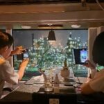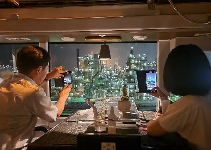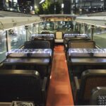 2階席はオープントップで向かい合わせのテーブル席になっている。揺れるバス車内でも料理やグラスが安定するようにすべり止めや転倒防止のための枠が設けられていて、首都高速道路走行中でも何の問題もなく食事が楽しめる。